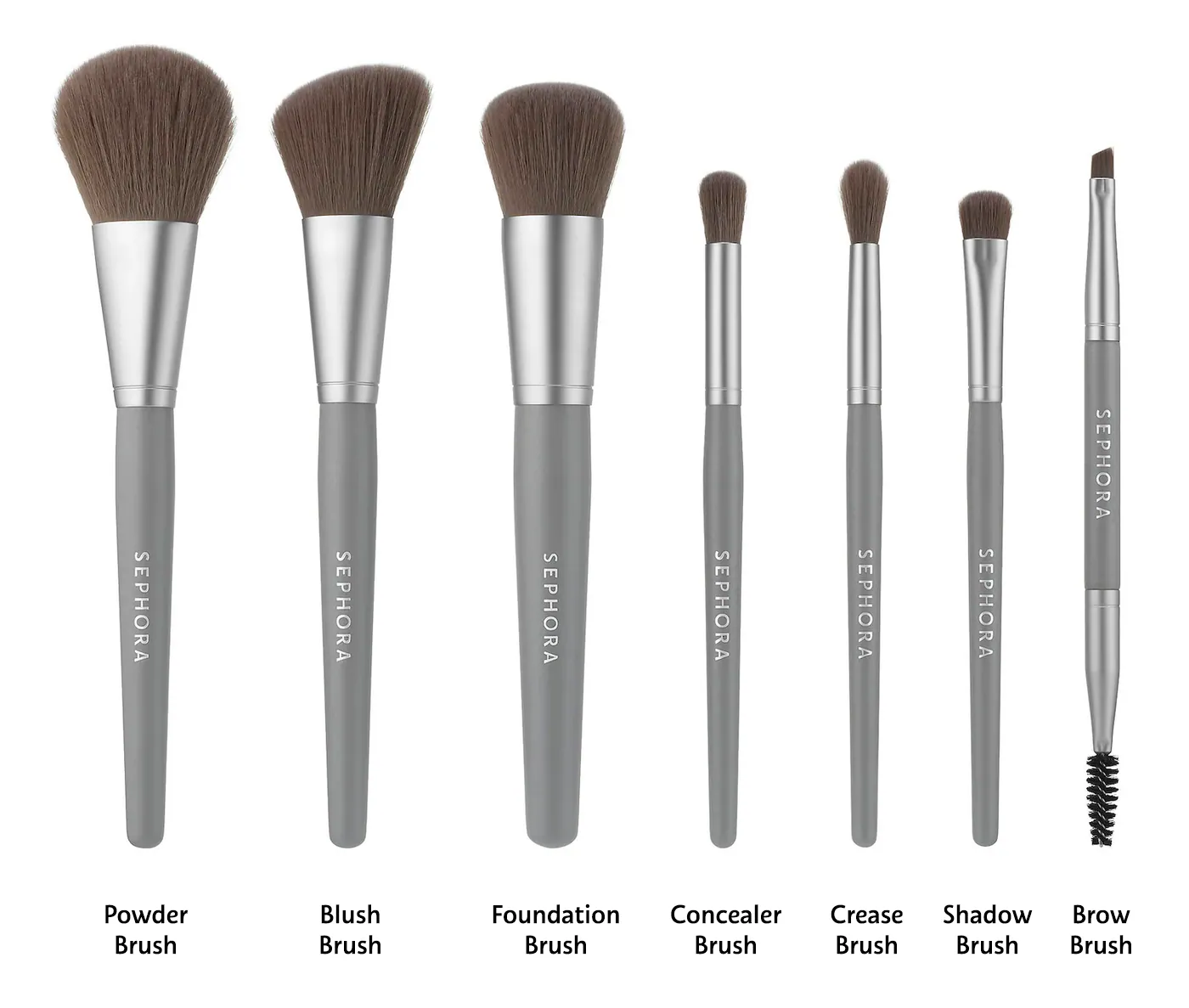مجموعة من سبع فراشي ناعمة ونباتية توفر لكِ جميع الأدوات الأساسية لإكمال مكياج وجهك بالكامل.