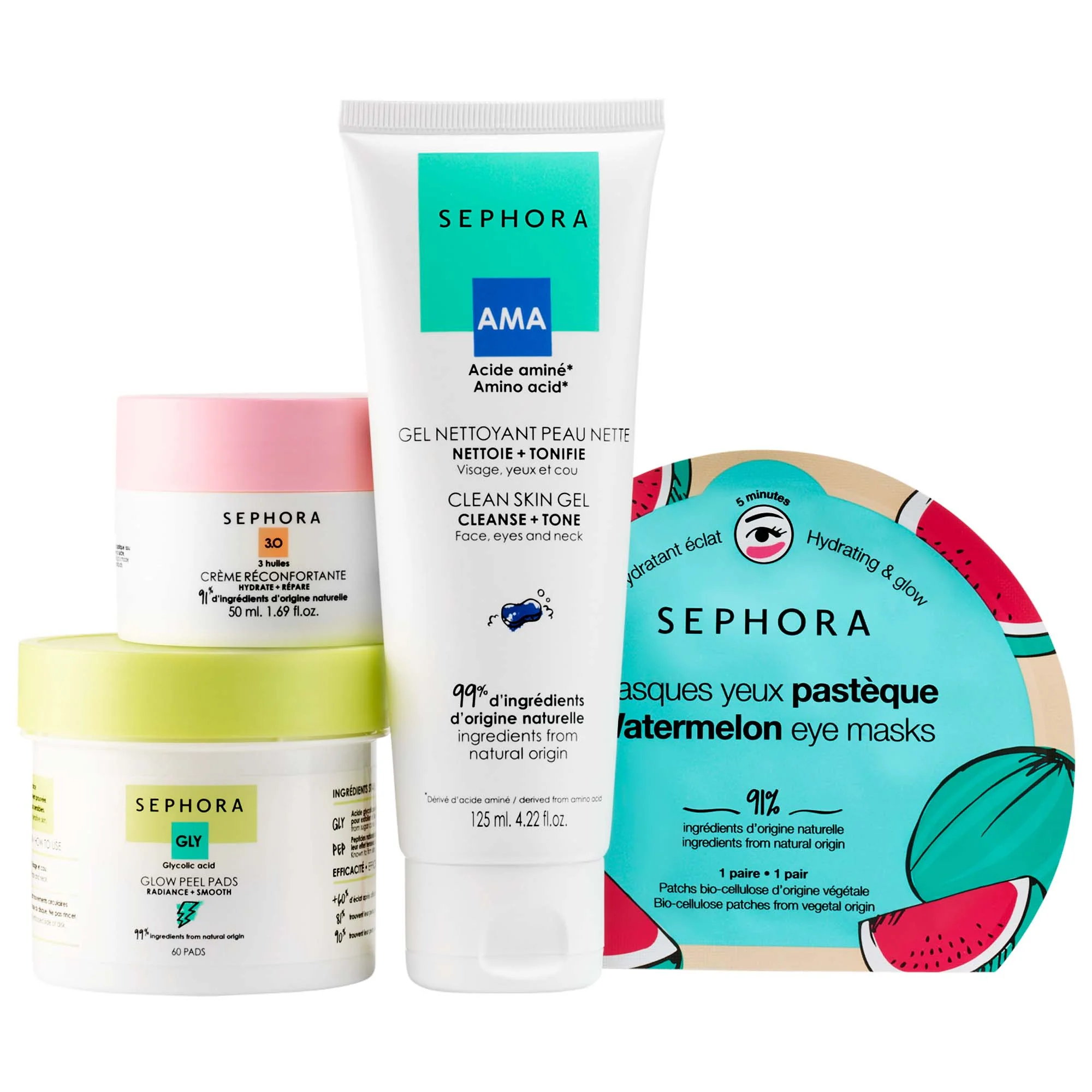 يحتوي جل تنظيف البشرة على الأحماض الأمينية والصبار، مما يزيل المكياج وينظف البشرة ويهدئها. تحتوي وسادات التقشير المتوهجة على حمض الجليكوليك والببتيدات والصبار. يزيل التقشير الرواسب التي تسد المسام وخلايا الجلد الميتة. أقنعة العين بالبطيخ هي أقنعة من السليلوز الحيوي بمكونات نباتية، تُعالج مشاكل أسفل العين، مثل الجفاف والهالات السوداء، في خمس دقائق فقط. يحتوي مرطب البشرة المغذي على مزيج من ثلاثة زيوت طبيعية، هي الأفوكادو، والمارولا، وزيت بذور ثمر الورد، لتغذية وحماية حاجز البشرة.